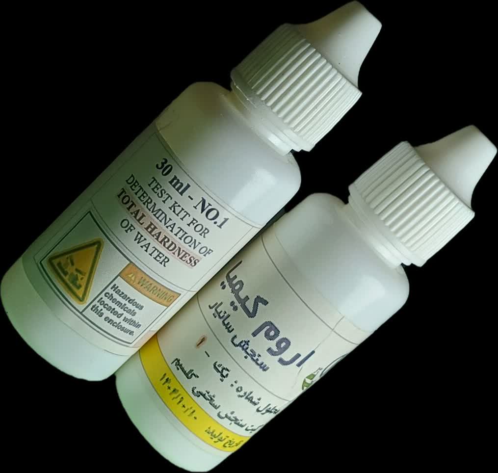 از فرمول زیر استفاده کنید: سختی کل (ppm CaCO₃) = تعداد قطرههای محلول شماره ۲ مصرفی × ۱۰ |